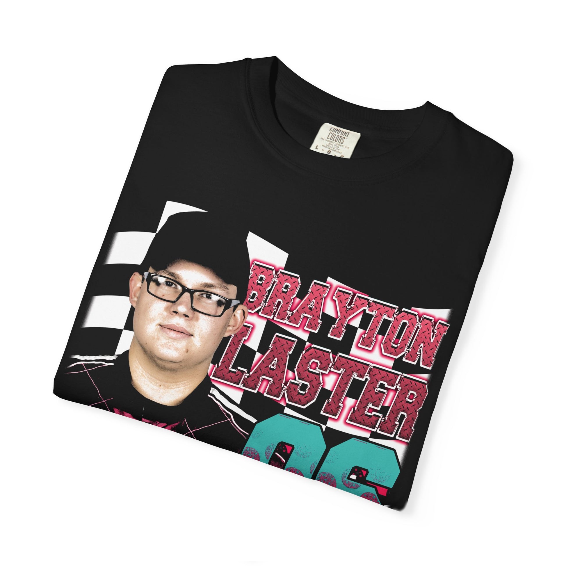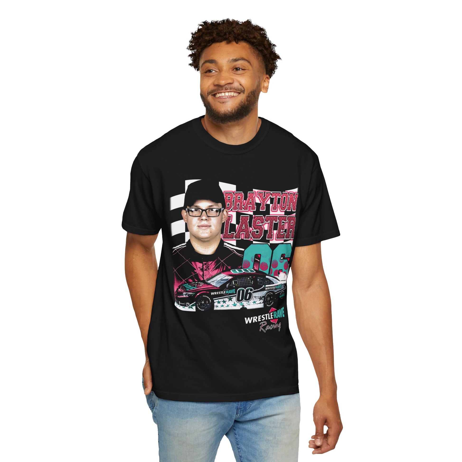 This WrestleRave Racing tee features Brayton Laster, “The Pizza Man,” front and center alongside a WrestleRave-branded stock car, designed in a loud, throwback WWF Racing–style layout. Chrome racing typography, layered photo graphics, and bold motion elements give this shirt straight early-2000s motorsports vibes.
